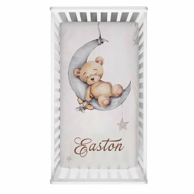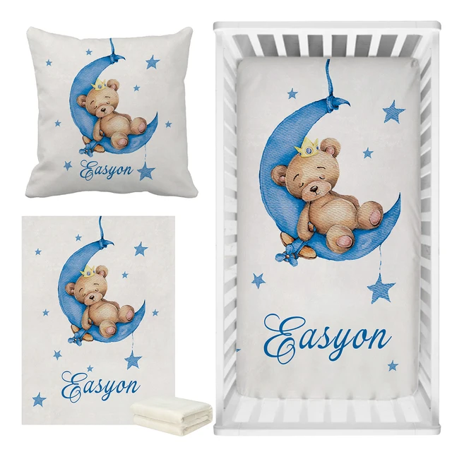LVYZIHO Sleeping Bear Custom Name Crib Sheet Set, Sleeping Bear Sleep on Moon Crib Bedding Set, Baby Shower Gift Bedding Set