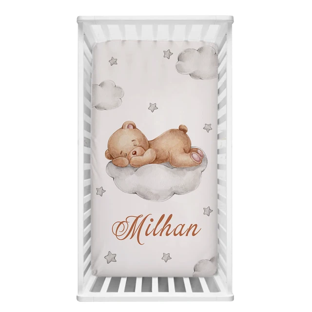LVYZIHO Sleeping Bear Custom Name Crib Bedding Set, Moon, Cloud and Stars Baby Shower, Personalized Crib Sheet For Boy And Girl