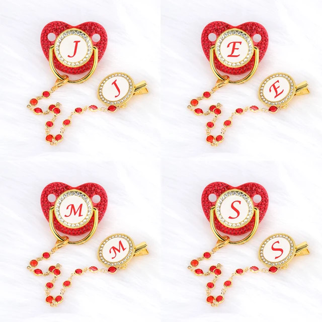 Red Rhinestone Initials Baby Pacifier with Chain Clip Cover Set Luxury 26 Letters Newborn Personalized Pacifiers Silicone Nipple