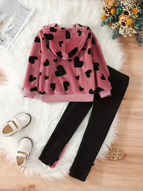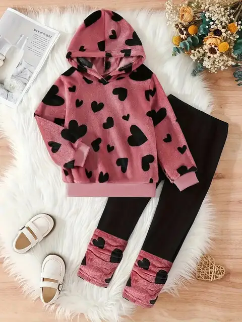 Girl’s Heart Allover Print Outfit 2pcs, Fleece Hoodie & Leggings Set, Kid’s Clothes For Spring Fall