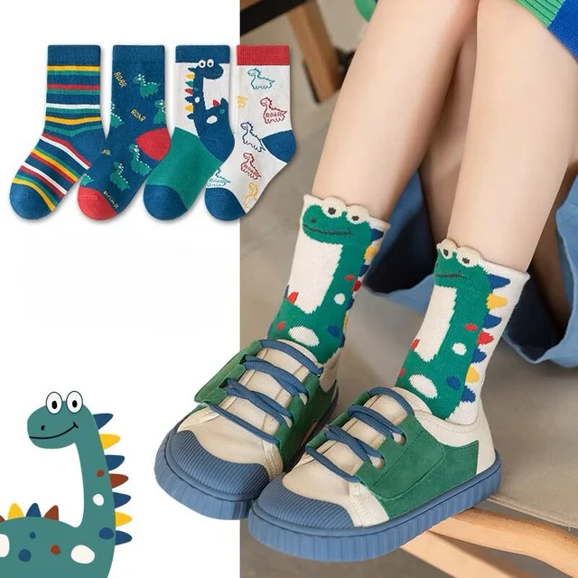 5 Pairs Autumn Winter New Style Children’s Socks Mid-high Long Dinosaur Cartoon Design Boys Girls Baby Cartoon Socks Wholesale