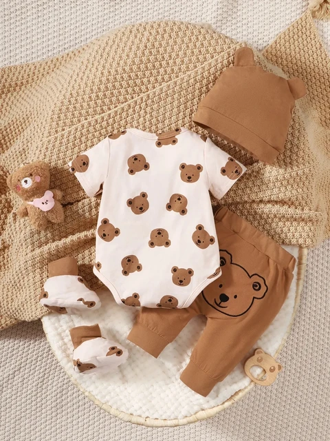 4PCS Clothing Set 0-9 Months Newborn Baby Boy Bear Short Sleeve Romper+Pants+Hat+Sock Infant Baby Full Moon Photography Outfits