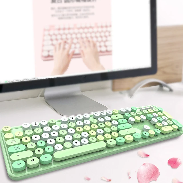 UBOTIE Colorful Wireless Keyboard and Mouse Combo 104 Keys Round Retro Keyboard with Number Pad Typewriter Good Gift for Girl
