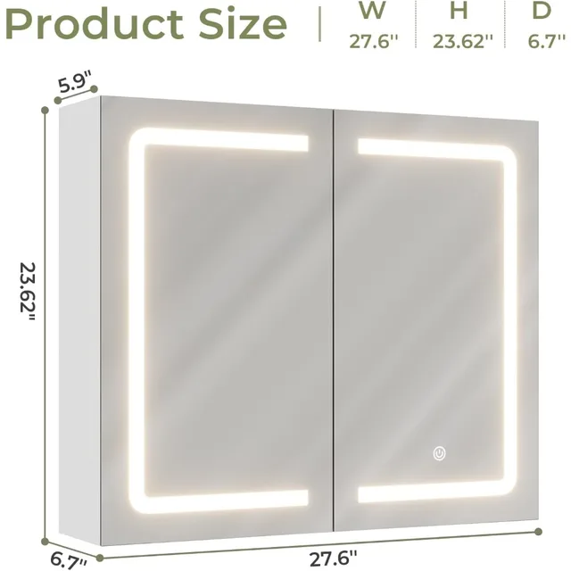 Bathroom Medicine Cabinet with Mirrors and Led Lights 27.6×23.62 inch Double Doors Wall Mounted Mirror Cabinet