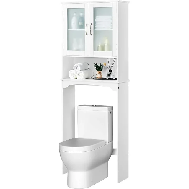 Over The Toilet Storage Cabinet with Double Tempered Glass Doors and Adjustable Shelf, Freestanding Bathroom Storage Rack