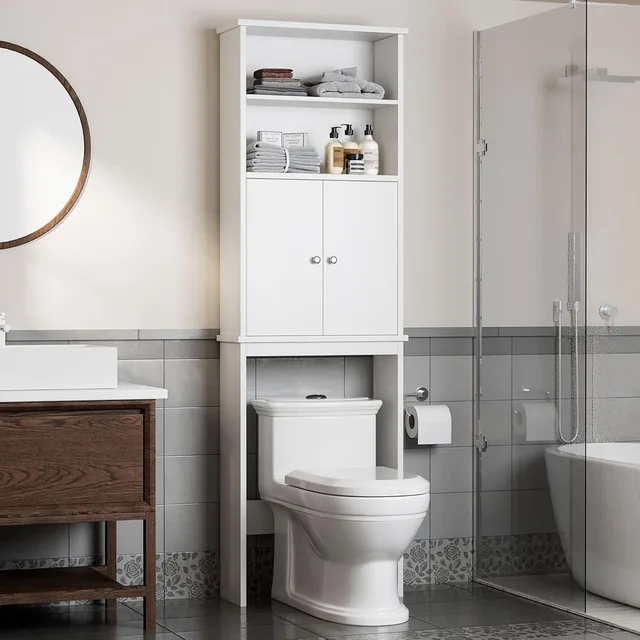 Over The Toilet Storage Cabinet Bathroom Shelf Organizer with Anti-Tip Device Small Freestanding Space Saver White
