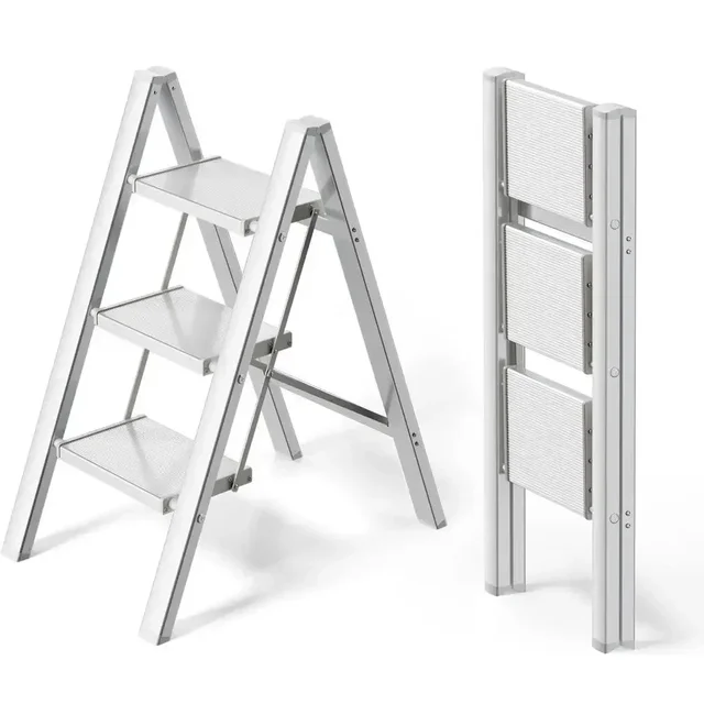Step Ladder Aluminum Folding Step Stool W/ Wide Anti-Slip Pedal Home Office Lightweight Portable Stepladder (Silver,black)