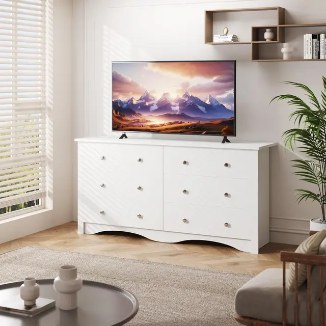 6 Wood Drawers Dresser for Bedroom, Double Dresser for TV up to 65 inch, TV Stand Storage Chest of Drawers for Living Room Hallw