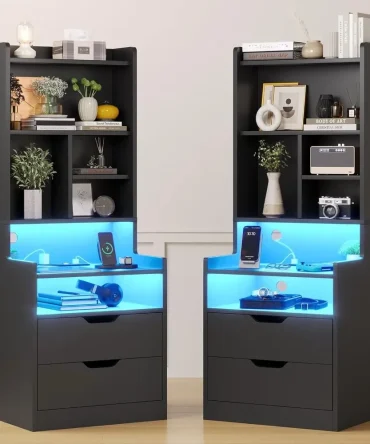 Charging Nightstand Set of 2 with LED Lights,Tall Night Stand with Bookshelf,Bedside Table with Drawers