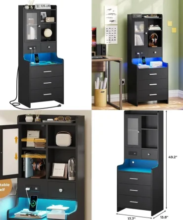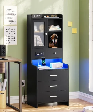 contemporary 49.2″ led-lit nightstand with charging port and storage shelf