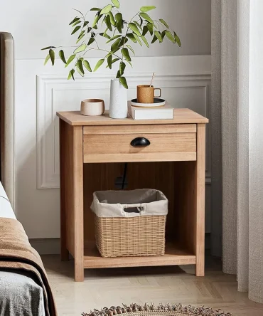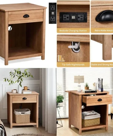 charging station nightstand in farmhouse style, pine wood with drawer for bedroom use