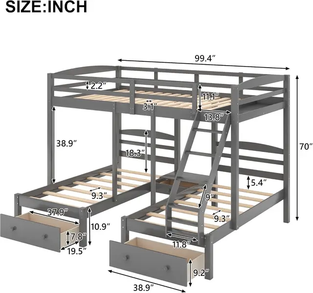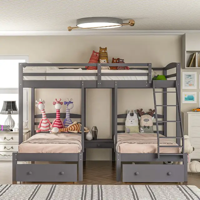 over Twin & Twin Bunk Bed,Triple Bunk Bed Frame for Boys Girls Kids Adults Toddler with Drawers, Gray