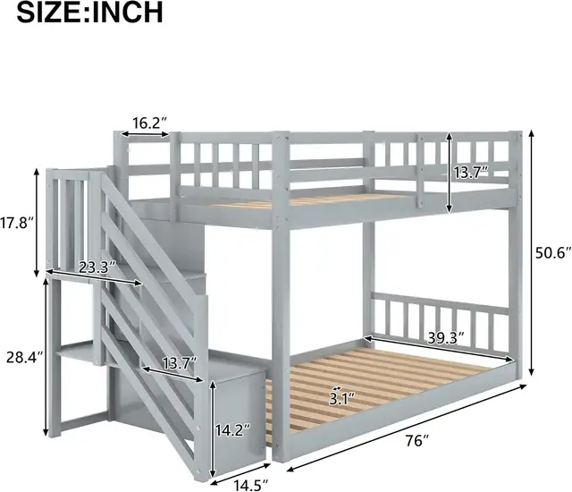 Twin Over Twin Junior’s Low Bunk Bed with Storage Stairs,Wood Floor Bunk Bed with Storage for Kids Teens,Floor Twin Size Bunk Be