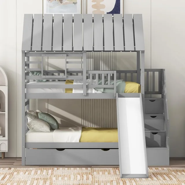 Kids Twin Over Twin Bunk Beds with Slide and Trundle, Bed Frame with Stairs and Storage, Playhouse Bunk Bed with Roof and Window
