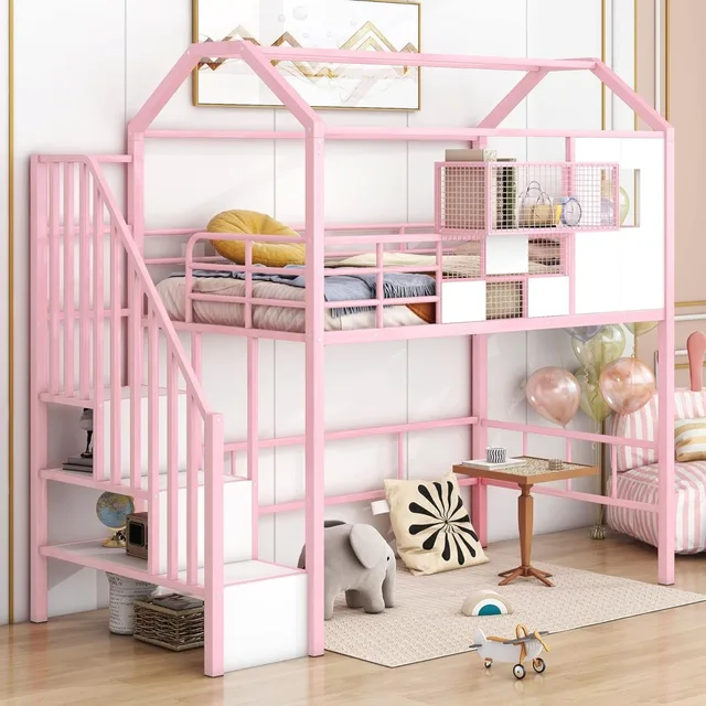 Twin Size House Loft Bed with Stairs and Storage Box, Cute Metal Loft Bed for Kids Bedroom, No Noise, Pink