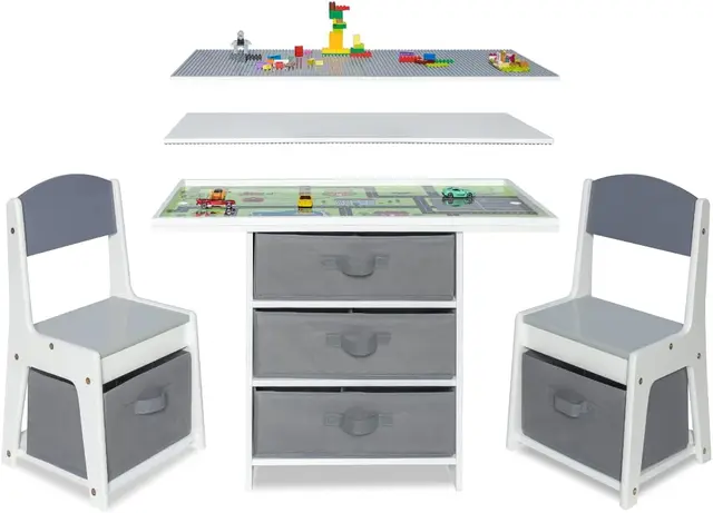 Kids 3-in-1 Play Table and Chair Set Wood with Storage Baskets, Compatible with Lego and Duplo Bricks, Activity Table Playset