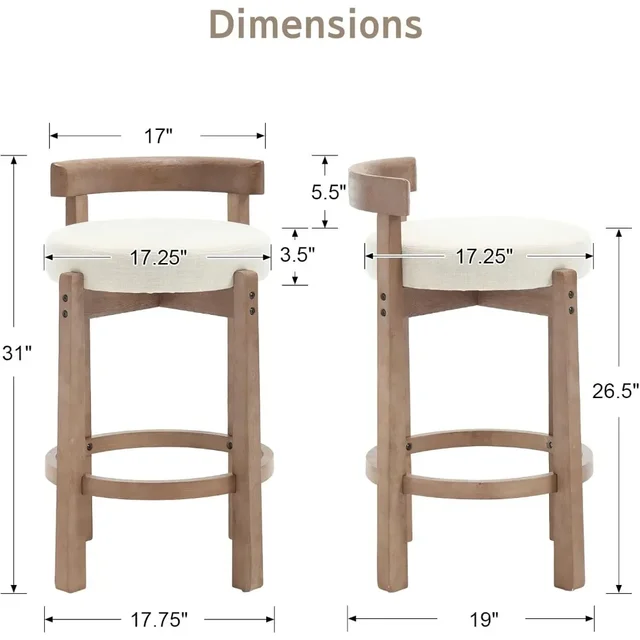 Mid-Century Bar Stools Set of 4, 26.5 Inch Linen Counter Height Upholstered Barstools Bar Chairs with Solid Wooden Legs for