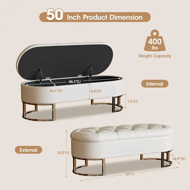 Vabches 50”L Ottoman Storage Bench Upholstered Leather Long Stool with Metal Legs Modern Storage Bench for Living Room Entryway