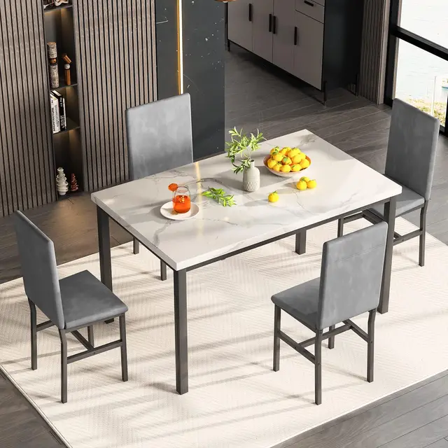Dining Table Set for 4, 5-Piece Marble DiningTableSet with 4 Velvet Metal Frame Chairs for Kitchen, Bar, Living Room