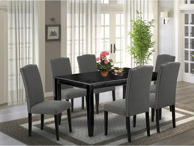 Dudley 7 Piece Modern Dining Set Consist of a Rectangle Wooden Table and 6 Dark Gotham Linen Fabric Upholstered Chairs