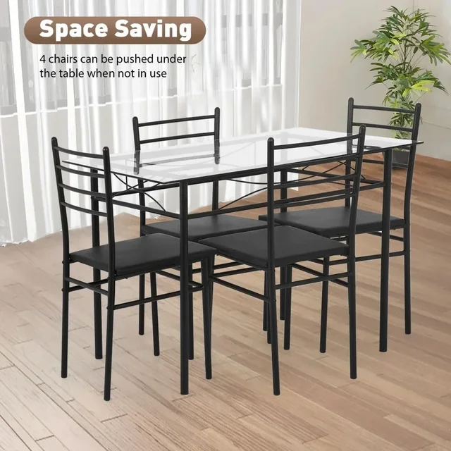 Kitchen dining table and chairs 5-piece set, classic dining table set, glass top table and 4 rectangular chairs with metal legs