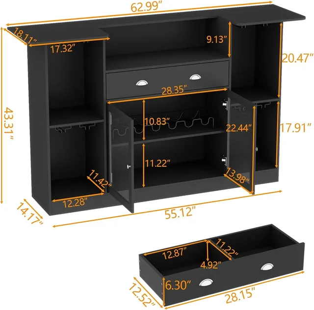 Bar Table Cabinet with LED & Drawer, Mini Liquor Bar with 8-Tier Storage & Stemware Holder, Crescent Shaped Counter for Home Pub