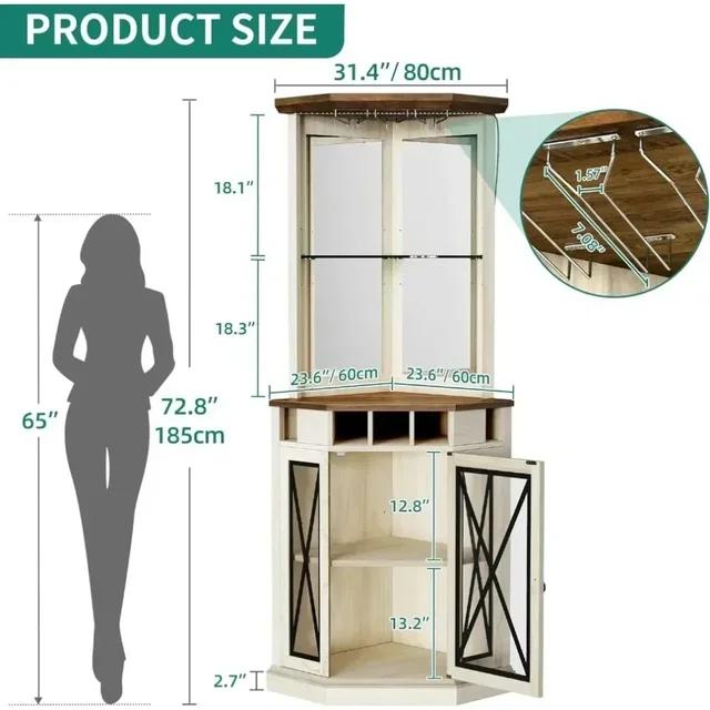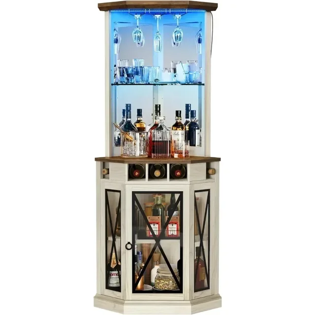 Corner Bar Cabinet w/ LED Lights, 72″ Tall Farmhouse Wine Bar Cabinet w/Visualization Glass Door & Adjustable Shelves, Off White