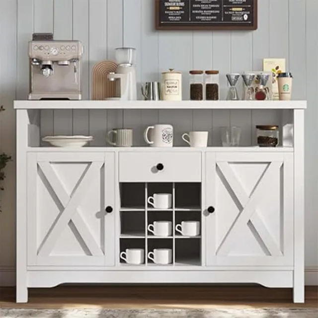 Coffee Bar Cabinet with Storage, 47” White Coffee Bar Station Cabinet, Farmhouse Coffee Bar Buffet Cabinet with Drawer