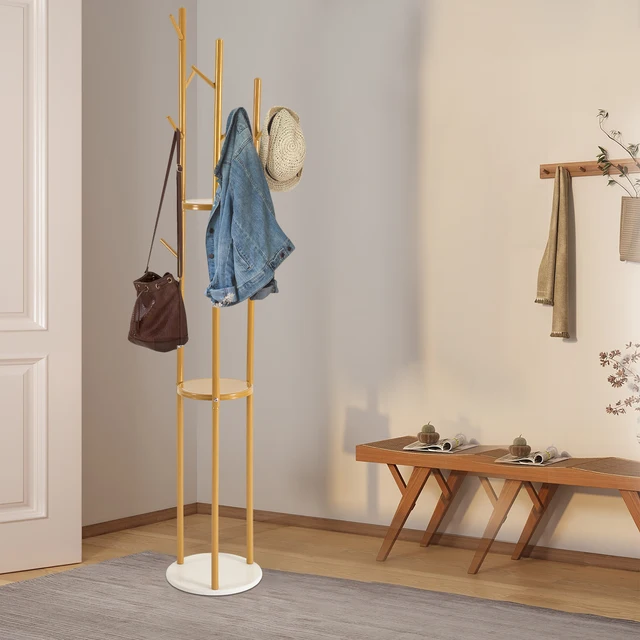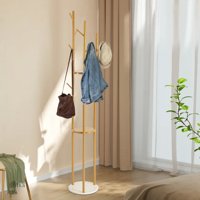 Metal Gold Coat Rack Entryway Corner Stand Hat Coat Hanger with Marble Base Heavy Duty