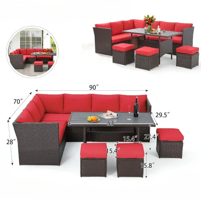 7 Pieces Patio Furniture Set, Outdoor Sectional Sofa Conversation Set, All Weather Wicker Rattan Couch Dining Table & Chair