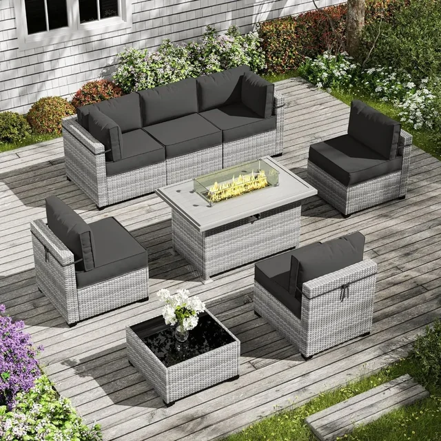 8 Pieces Outdoor Wicker Rattan Patio Furniture Sectional Set,Glass Top Table Hidden Storage,7 Sofa Sections, Oversized Cushions