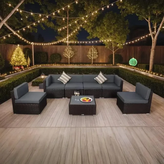 7 Piece Outdoor Patio Furniture Sets with Cushions,Patio PE Rattan Wicker Conversation Couch Sets with Slatted Table,Pillows