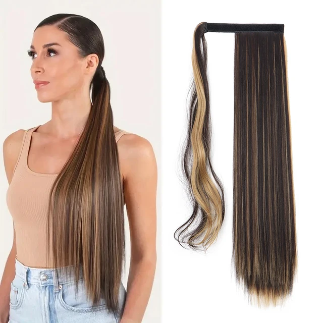 24Inch Synthetic Long Straight Ponytail Wrap Around Clip in Hair Extension Black Brown Blonde Hairpiece for Women