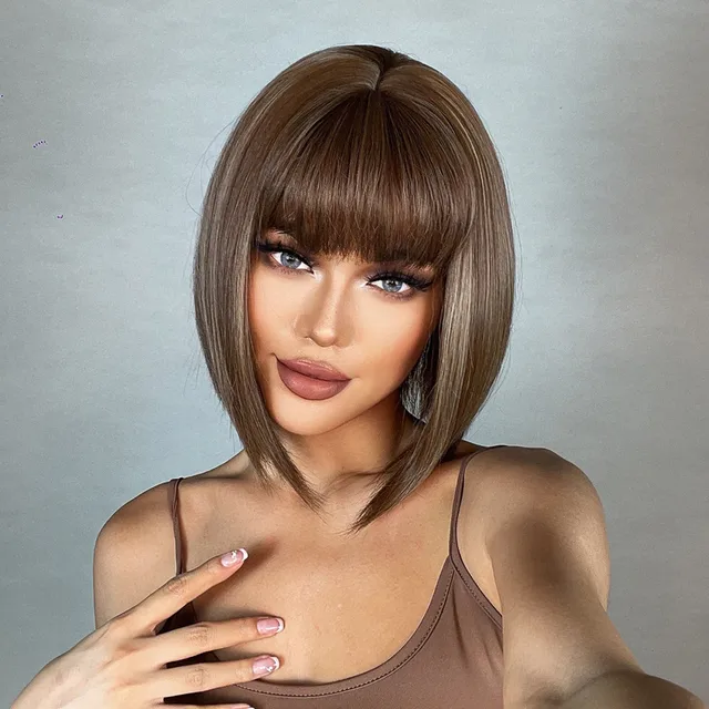 Short Black Brown Synthetic Natural Hair Wigs for Women Bob Straight Wig with Bangs High Temperature Daily Cosplay Party Wigs