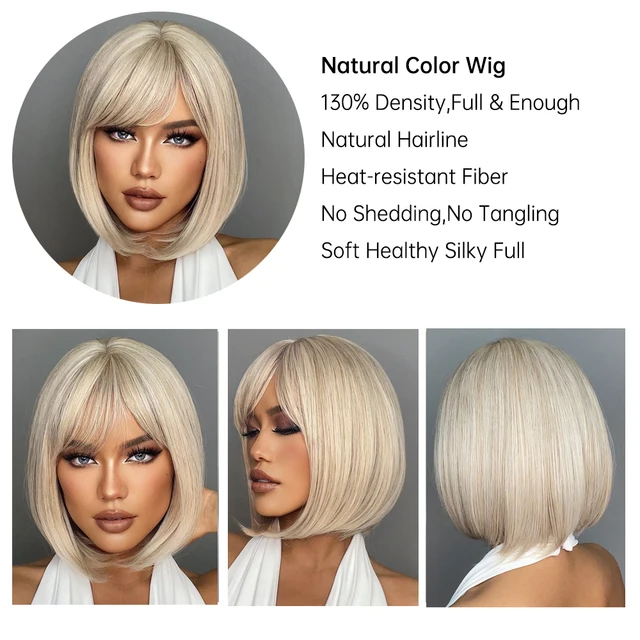 White Blonde Gray Synthetic Wigs with Bangs Short Straight Bob Hair Wig for Women Cosplay Daily Natural Hair Heat Resistant