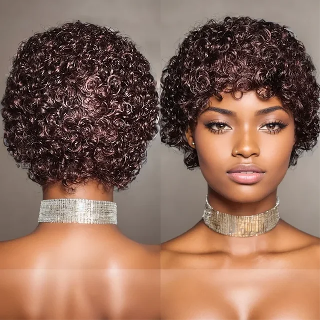 Short Pixie Afro Kinky Curly Wigs for Black Women Glueless Natural Brown Bob Wig With Bangs Jerry Curly Human Hair Wigs Allure