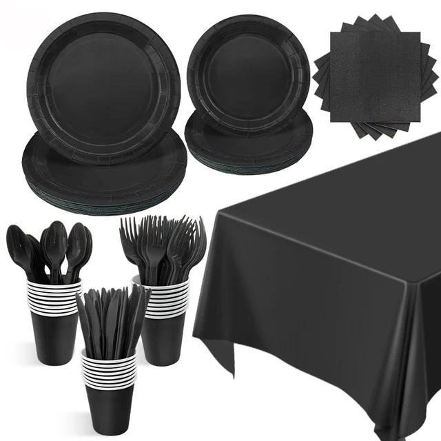 Solid Black Theme Birthday Super Girls Decorations Party Disposable Tableware Paper Napkins Cups Plates Tablecloths Straw