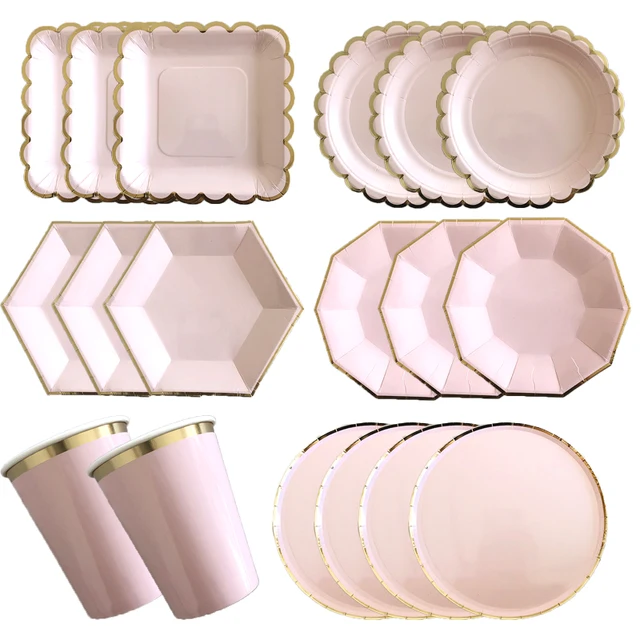 Gold Disposable Tableware Set Pink Party Paper Plates Napkins Cup Straws Birthday Party Wedding Decor Christmas Party Supplies