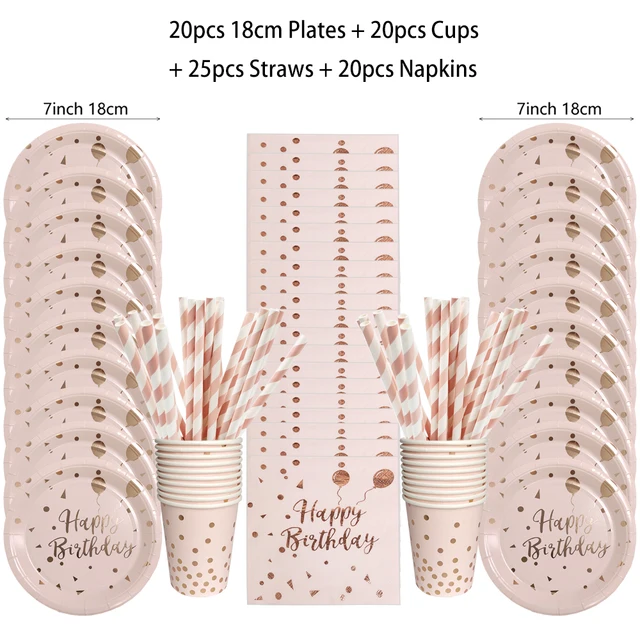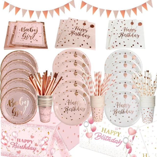 Birthday Disposable Tableware Set Pink Rose Gold White Plates Cups Napkins Tablecloth Girl Birthday Party Decoration Baby Shower