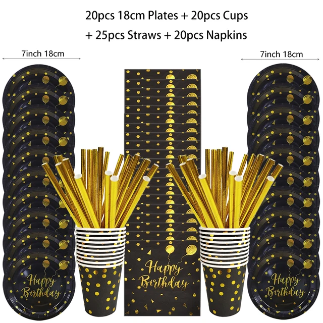 Black Gold Birthday Disposable Tableware Set Paper Plates Cups Napkins Tablecloth Adult Happy Birthday Party Decoration Wedding