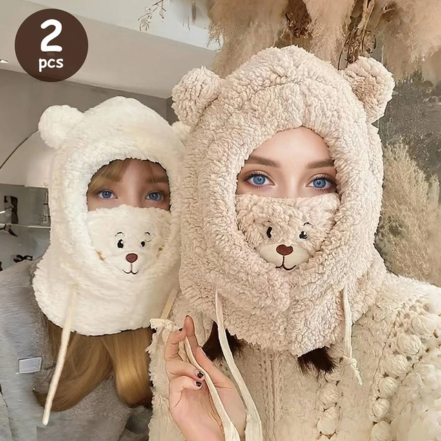 Cartoon Bear Fuzzy Hat, Ear & Neck Protection Winter Cute Hooded Hat, Comfortable Thermal Beanie Hat