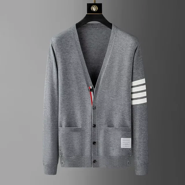 High end brand knitted cardigan men’s spring and autumn new classic stripe trend Korean casual side slit V-neck sweater coat