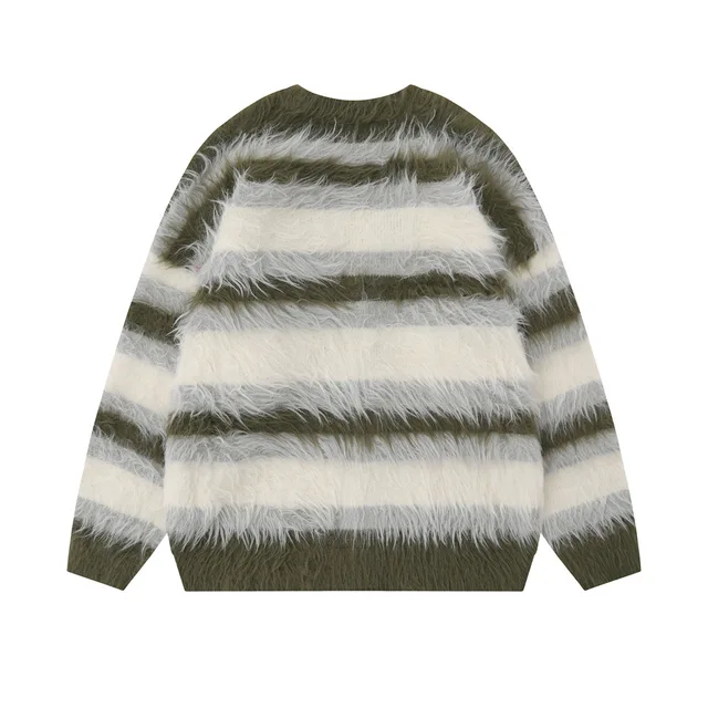 Striped Plush V-neck Sweater Men’s Loose Casual Brushed Knit Trendy Couple Versatile Comfortable Harajuku High Street Cardigan