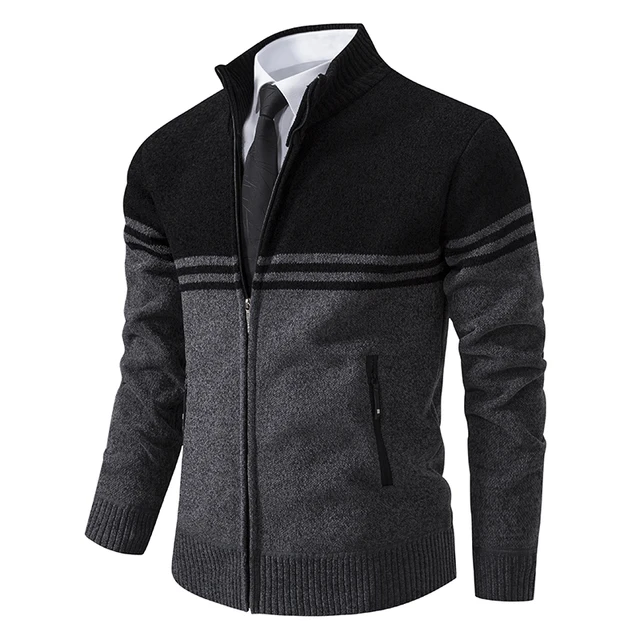Men’s New Winter Sweater Thick Fleece Warm Sweater Casual Stand Collar Zipper Cardigan Fashion Striped Coat