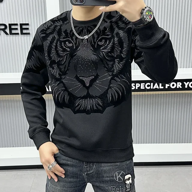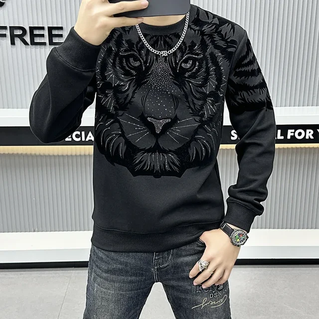 Trendy European Brand Men’s High End Embroidered Tiger Head Sweatshirt Vintage Round Neck Base Layer Top New 2023 Autumn Men