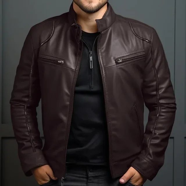 Mens Leather Jacket Autumn Winter Business Gentleman Warm Zipper Cardigan Pocket PU Leather Jacket Stand Collar Slim Coat