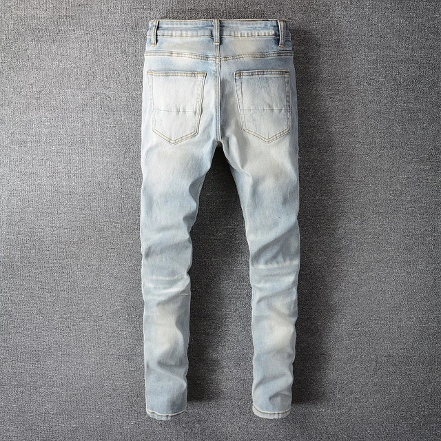 Men Crystal Holes Ripped Patchwork Jeans Streetwear Light Blue Denim Slim Skinny Pencil Pants Trousers