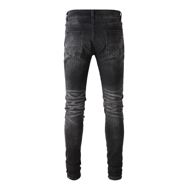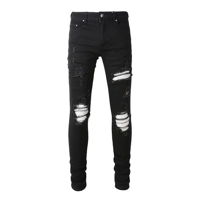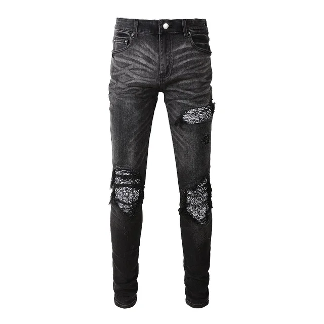Men Cracked Silver Leather Patch Biker Jeans Streetwear Skinny Tapered Stretch Denim Pants Holes Ripped Patchwork Black Trousers