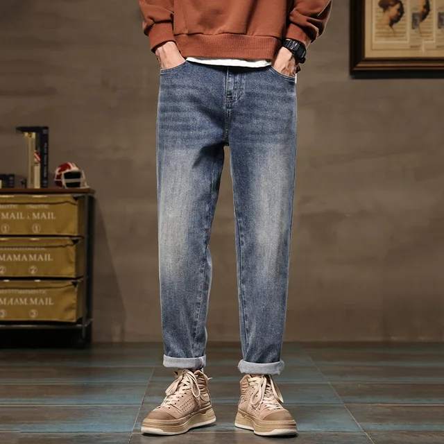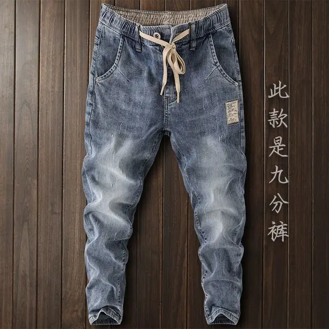 Luxury Korean Style Clothes Men’s Denim Jeans with Elastic Waistband Drawstring for Washed Autumn Casual Stretch Jeans Male