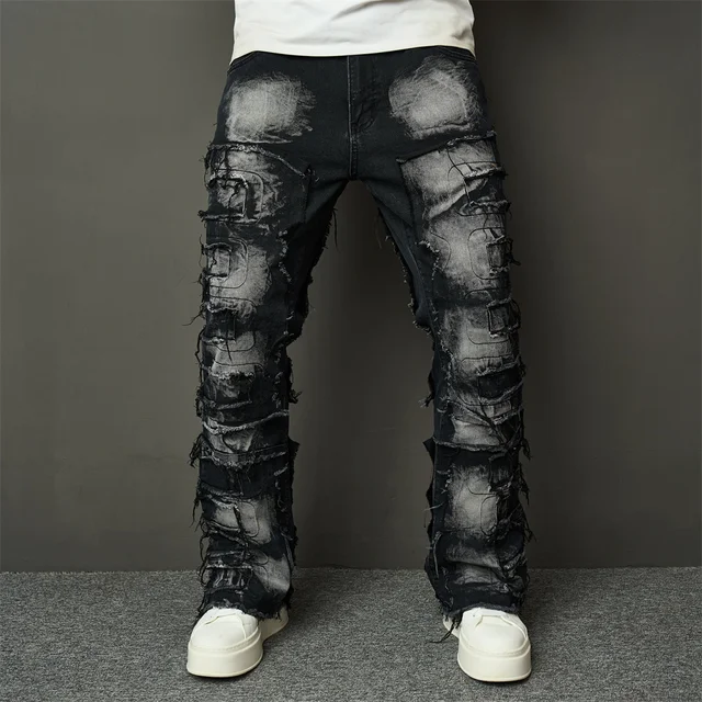 Streetwear HipHop Men Ripped Spliced Patch Straight Jeans Stylish Male Distressed Loose Biker Denim Pants